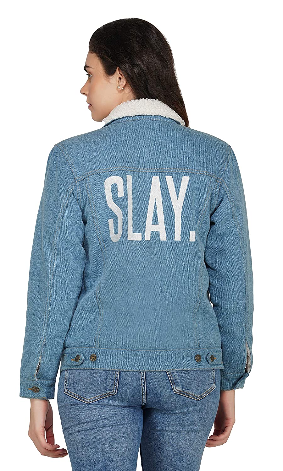 SLAY. Embroidered Women's Enzyme Washed Denim Jacket with Faux-fur Lining