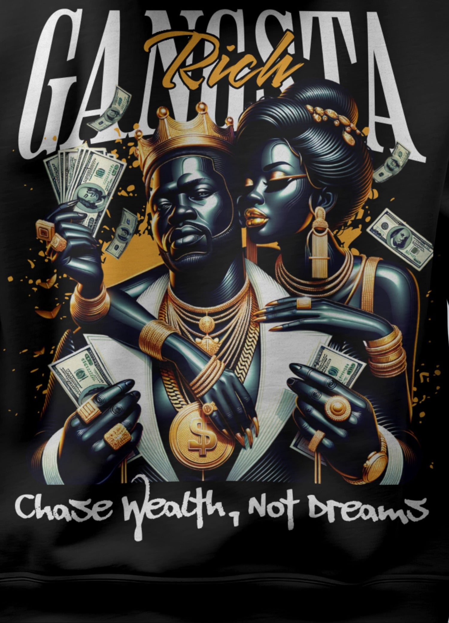Step up your streetwear game with SLAY’s Gangsta Rich oversized T-shirt! Featuring a bold GOLD METALLIC PRINT design of royalty-inspired artwork, this tee embodies luxury and swagger. The oversized fit with drop shoulders ensures a relaxed, statement-making silhouette, while the premium 300 GSM 100% cotton fabric provides unbeatable comfort and quality. Flaunt the motto “Chase Wealth, not Dreams” in style.
