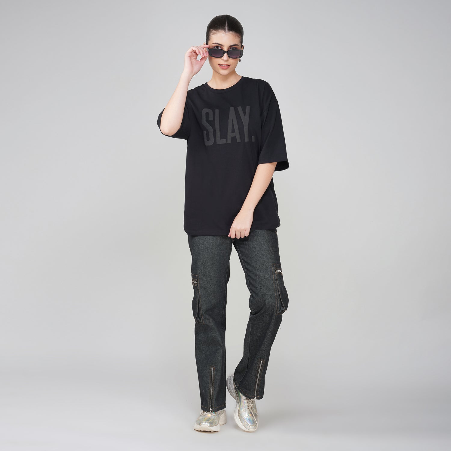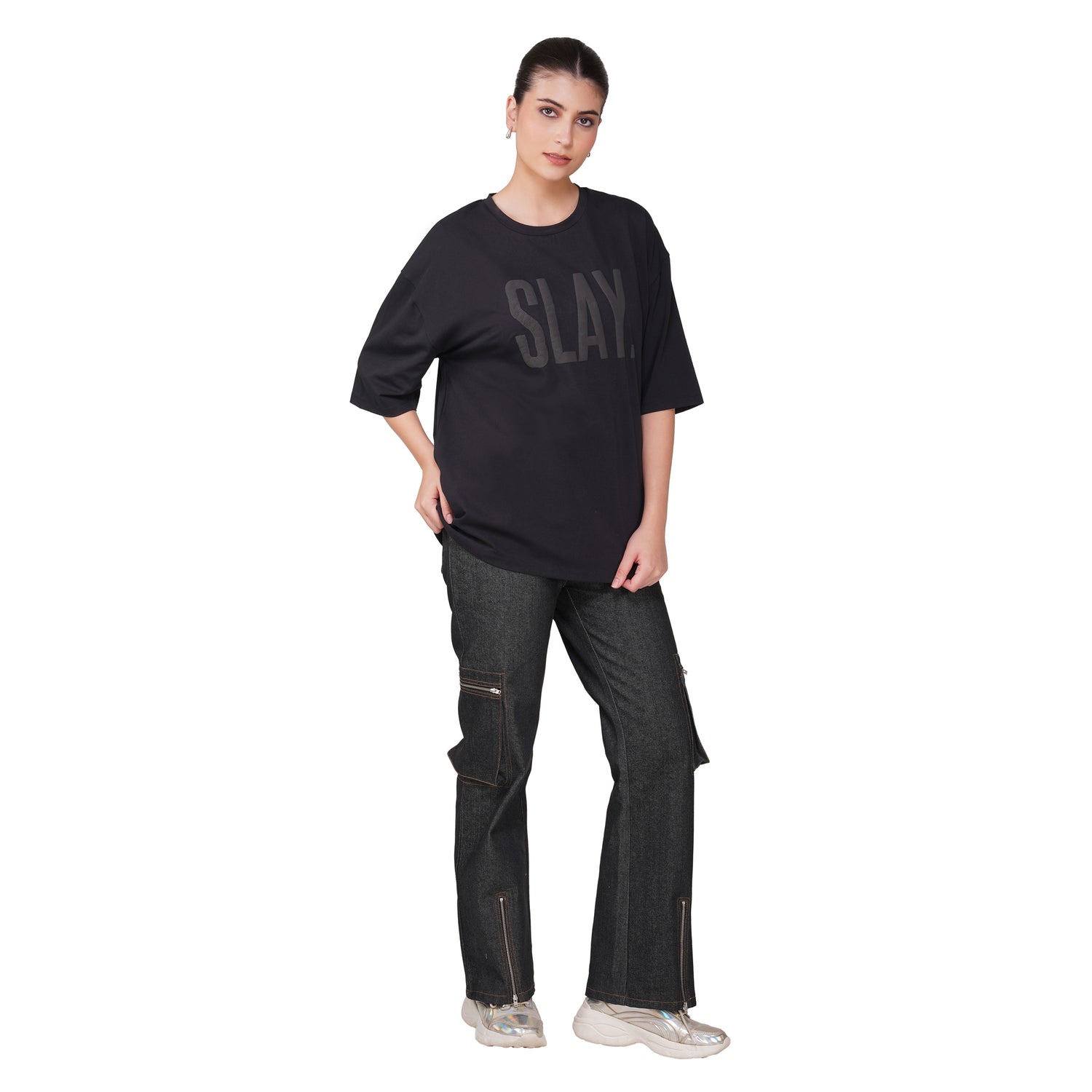 Step into your power with the SLAY. oversized t-shirt, designed to make a bold statement without saying a word. Crafted from premium cotton, this tee features a rich matte black puff print that elevates your everyday fit with effortless edge.