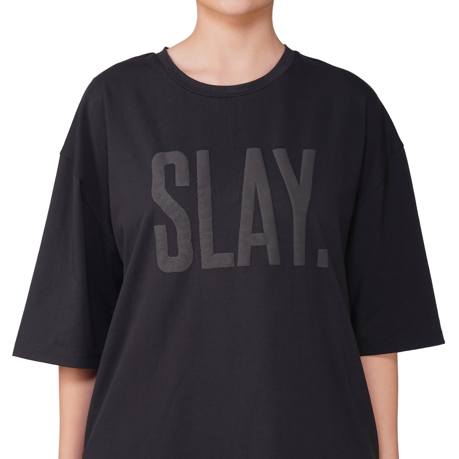 SLAY. Oversized Puff Print T-Shirt – Matte Black on Black