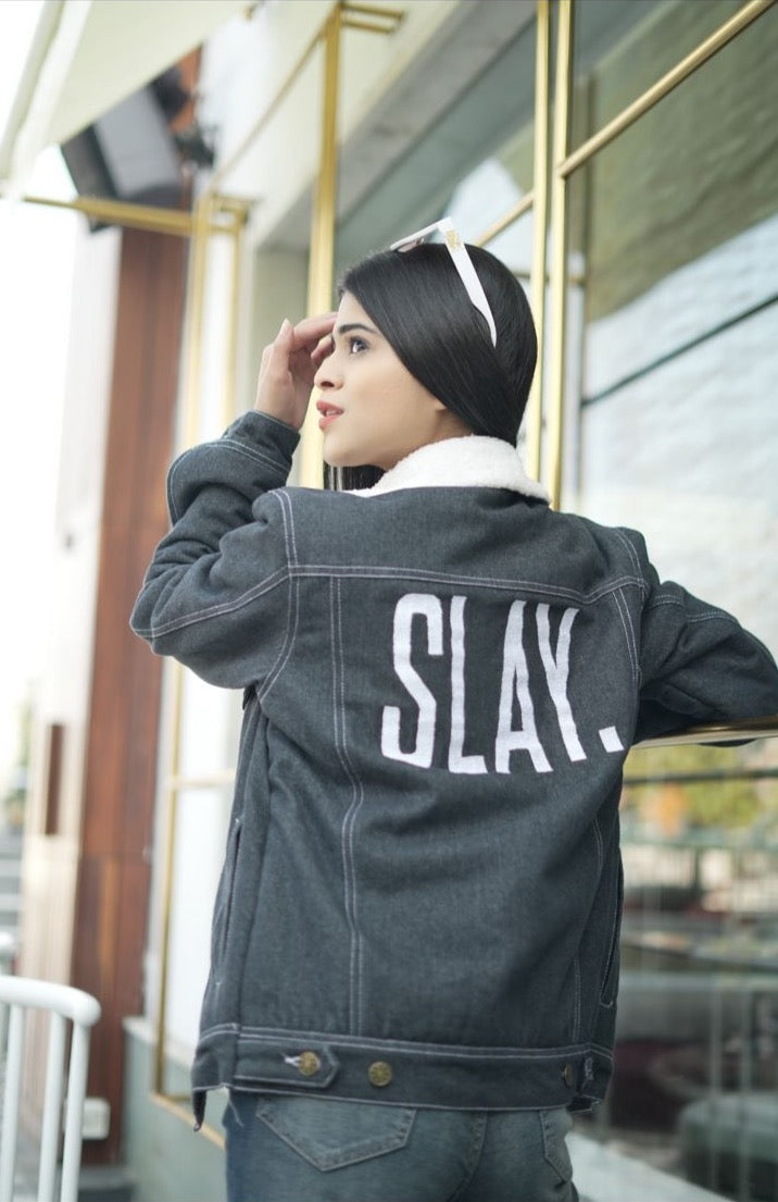 SLAY. Women's Black Denim Jacket with Faux-fur Lining
