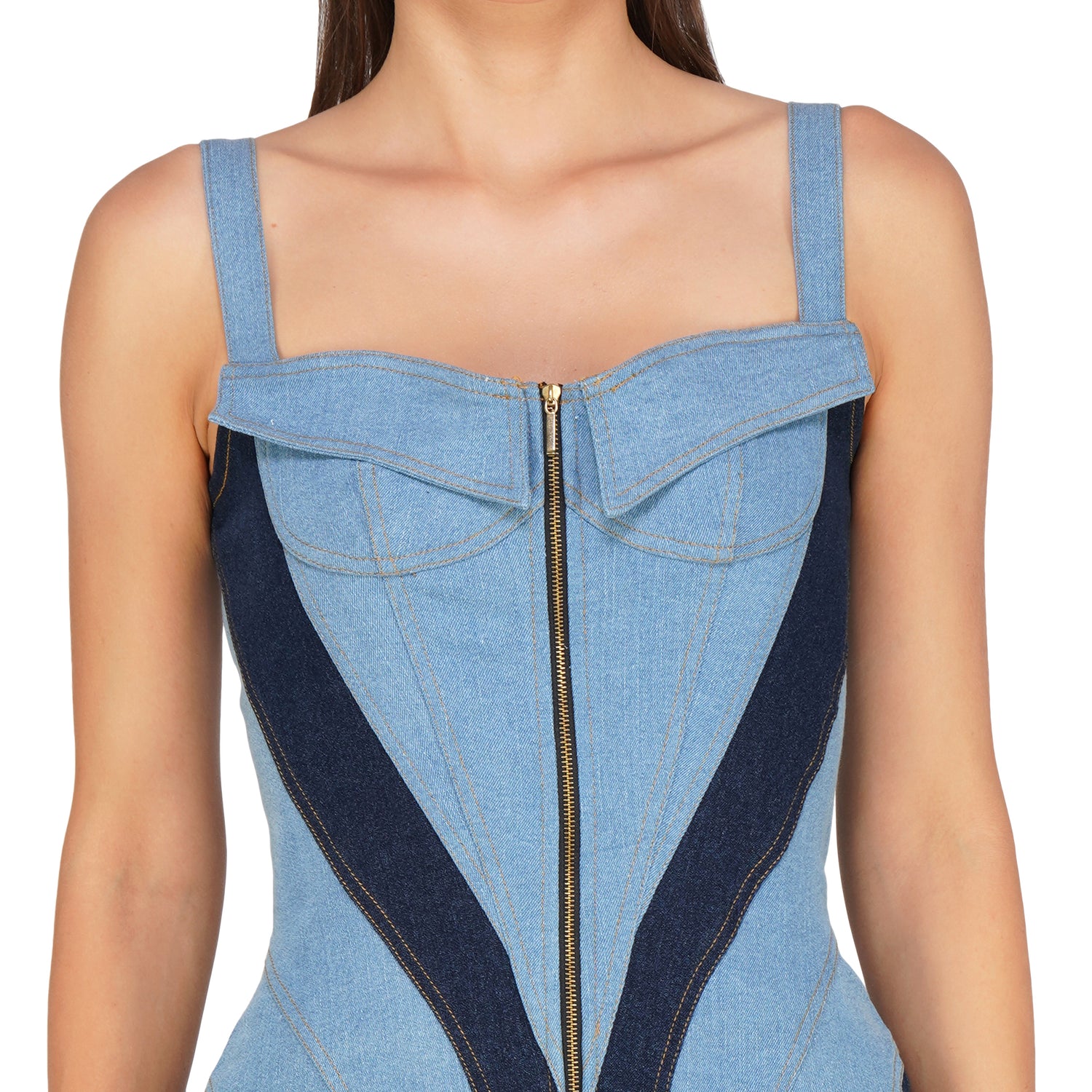 SLAY. Women's Paneled Enzyme Wash Denim Mini Dress (Stretch Fabric)